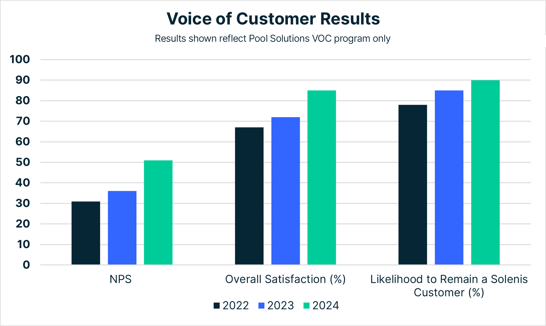 Although VOC methods across Solenis and Diversey may use different measurements or scales, maintaining consistency over time allows us to track progress effectively and make informed decisions. For example, our Pool Solutions business focuses on an NPS program with dealer channel customers. These customer satisfaction metrics help this team prioritize actions and enhance overall service performance. As a result of these efforts, their NPS scores have improved from +31 in 2022, increasing to +36 in 2023 and in 2024 reaching +51.