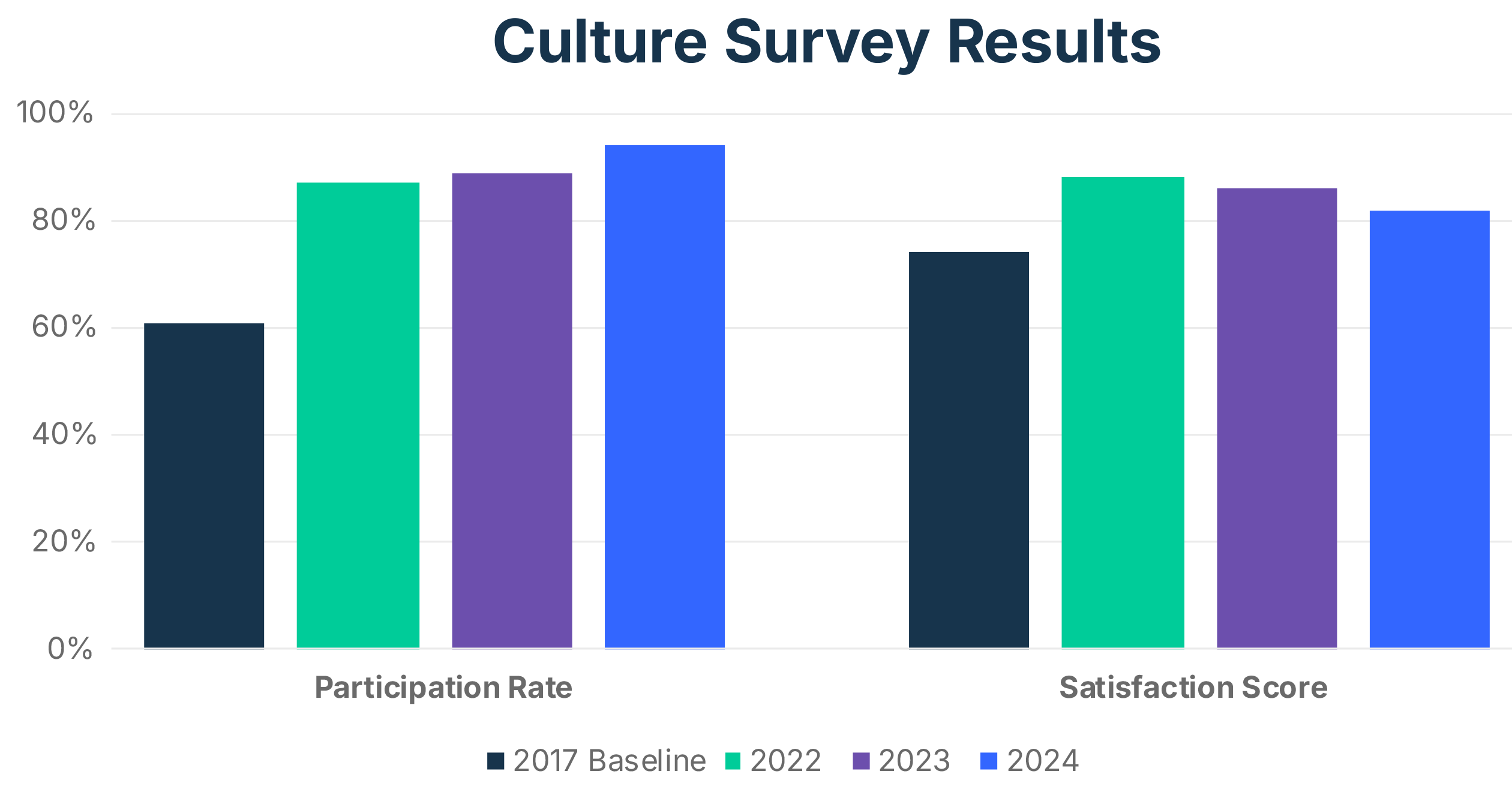 KPI: Improve employee engagement survey participation and satisfaction score each year