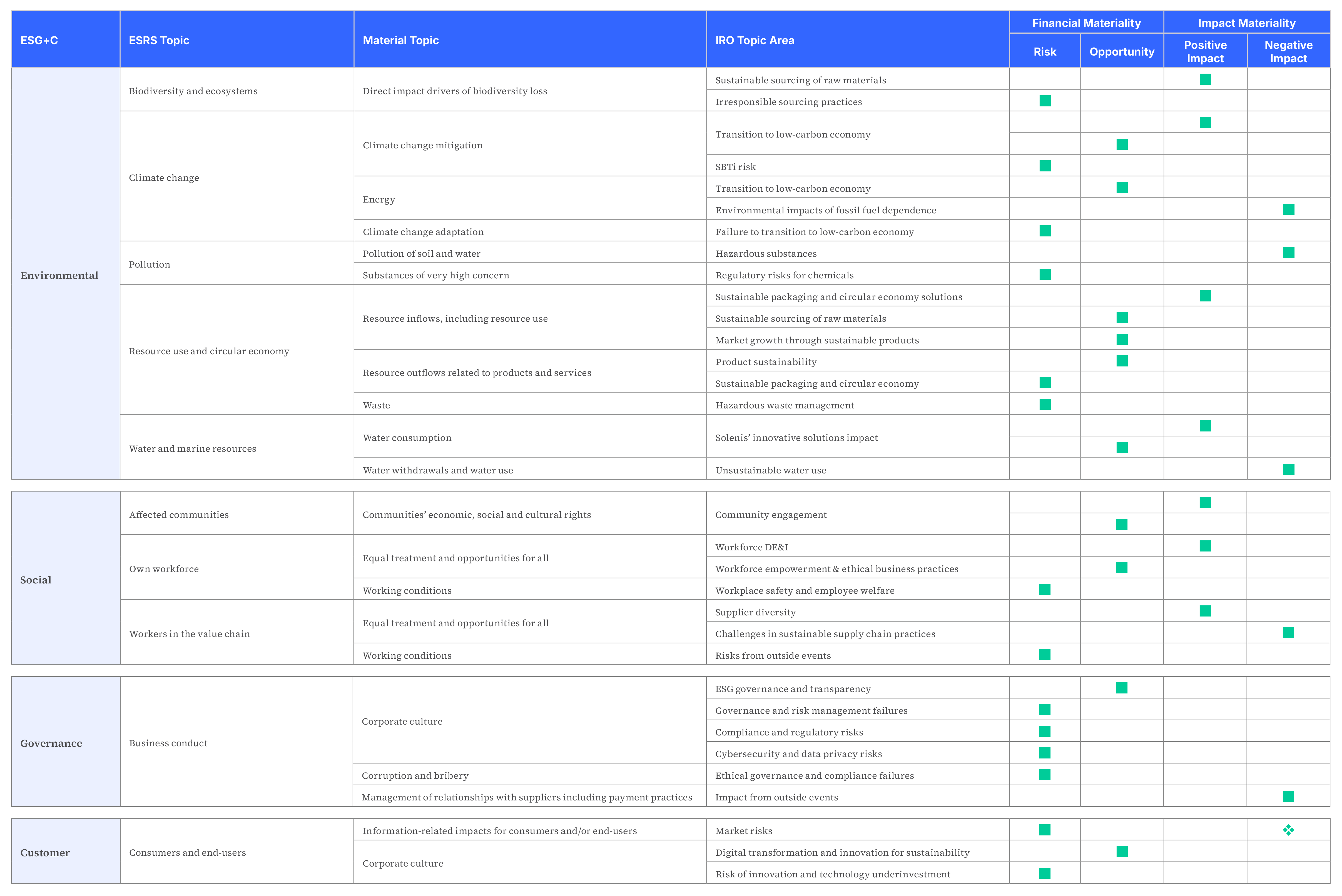 This work enabled us to better understand the sustainability risks and opportunities that influence Solenis’ business position from reputational, operational and financial perspectives, and will inform how we monitor and approach these matters going forward. In addition, a better understanding of our impacts on stakeholders, society, and the planet will help guide our efforts as we enhance our sustainability program. As a requirement of the CSRD, the DMA also helps support our regulatory compliance and tie our reporting to areas of key stakeholder interest.