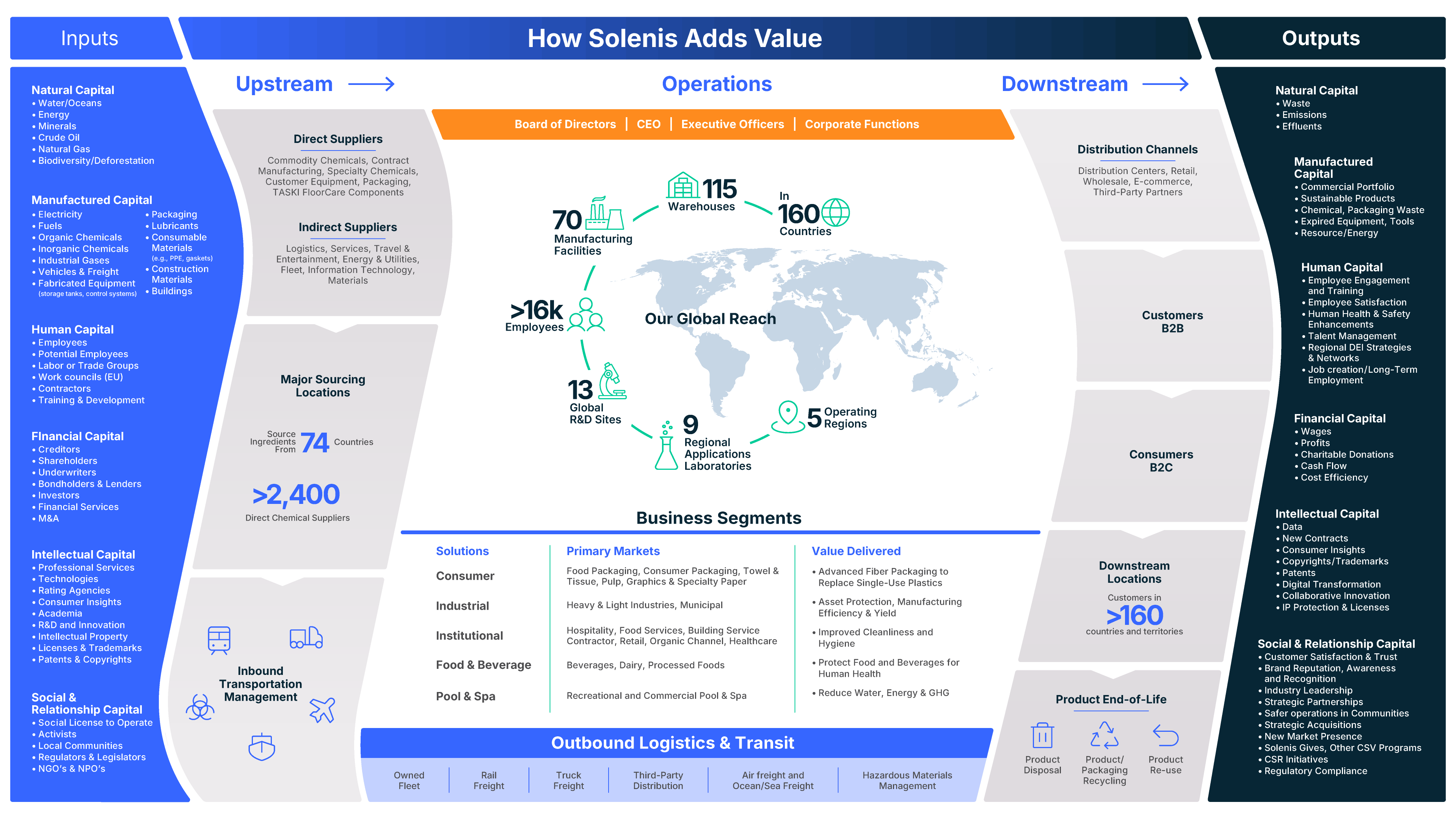 Solenis’ value chain reflects its ESG+C commitment, integrating responsible sourcing, operational excellence and customer-driven sustainability. With suppliers in 74 countries and just over 2,400 direct chemical providers, we ensure ethical and sustainable practices from the start. Our 70 manufacturing facilities, 115 warehouses and 16,000+ employees in more than 160 countries enable global reach and innovation to serve diverse industries.